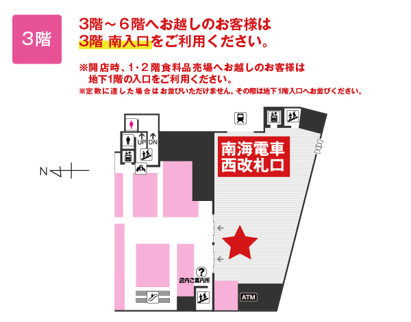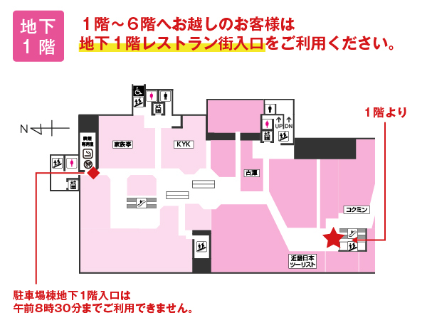 地下1階レストラン街入口、3階南入口に制限させていただきます。