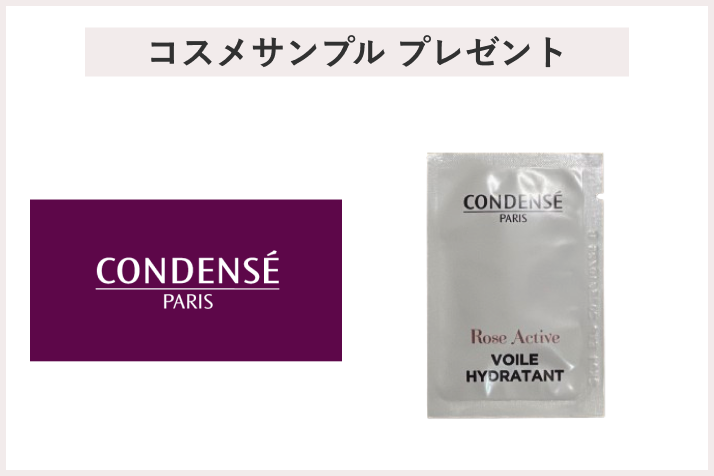 2024年11月20日(水)午前10時→12月18日(水)午前10時の期間中、<コンダンセ パリ>製品を税込4,400円以上お買上げのお客様、先着20名様に「ローズ アクティブ イドラ ベール(保湿ベール)3ml」をプレゼントいたします。