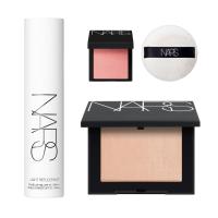 光沢感のある仕上がりでメイクをロックするプレストパウダーと、肌トーンを明るく整えるスキンケアプライマーに、にじみ出るような発色のブラッシュ Nからピーチピンクの777 特製サイズとミニパフがついた限定キット。