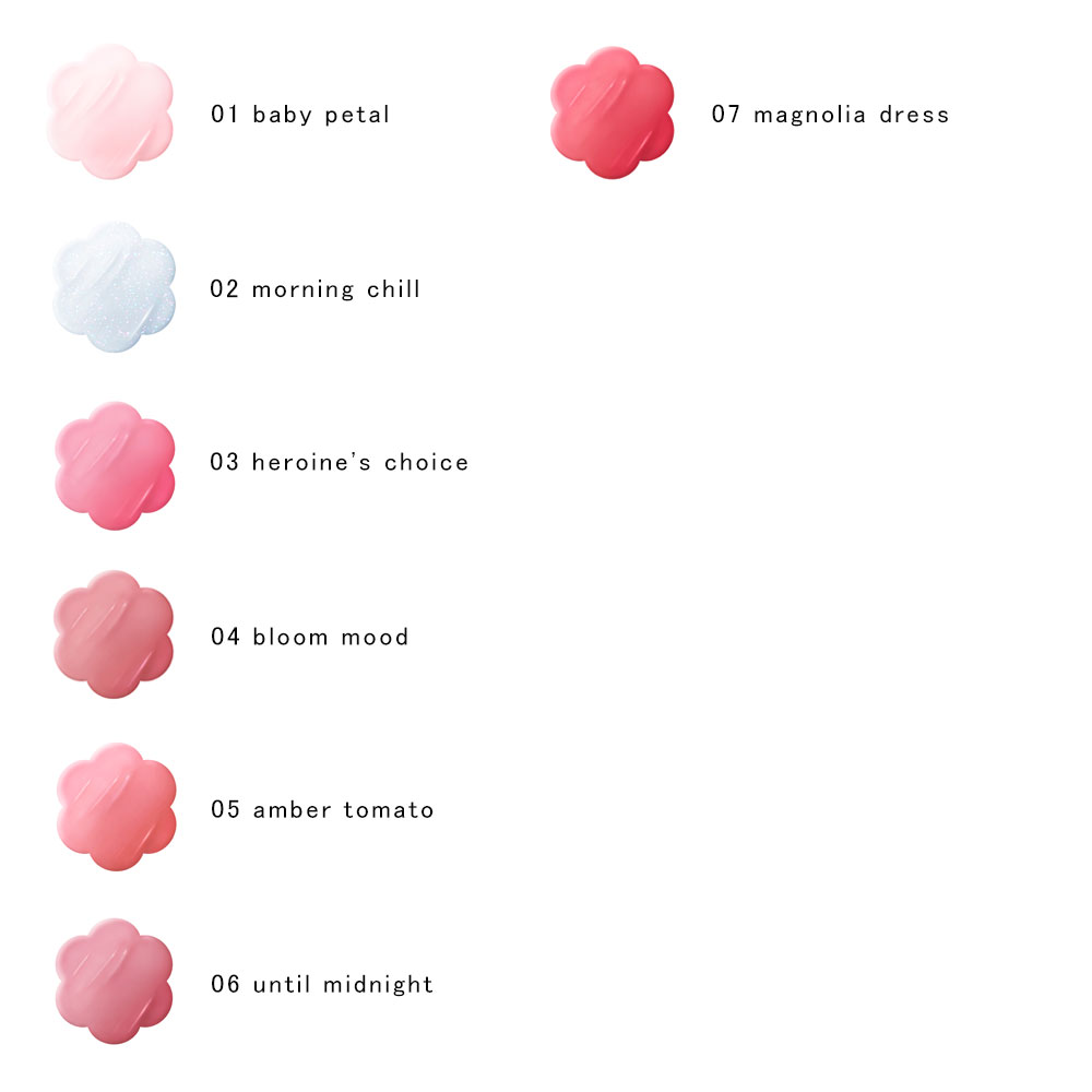 密着感の高いオイルとペーストオイルを配合することで、厚い膜でぷっくりとした唇に。さらに、塗布膜の均一性を出すオイルがつるんとしたツヤ高さに仕上げ、唇の凹凸をフラットにしながら、縦ジワが目立ちにくい立体感のある唇を目指します。