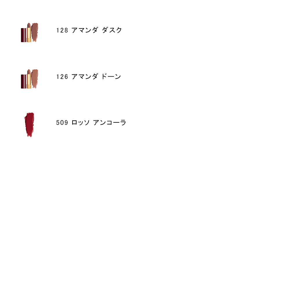 リミテッド エディションは全 3 色展開。既存色の深みのあるレッド (#509 ロッソ アンコーラ)と、夜明けと夕暮れのやわらかな光にインスピレーションを得た2つの限定カラーとして、温かみのあるアーモンドベージュ (#126 アマンダ ドーン)と、ほのかに陰りを帯びたアーモンドベージュ (#128 アマンダ ダスク)が登場。ホリデーシーズンの始まりからクライマックスの夜まで、すべての瞬間を魅力的に彩るカラーラインナップです。