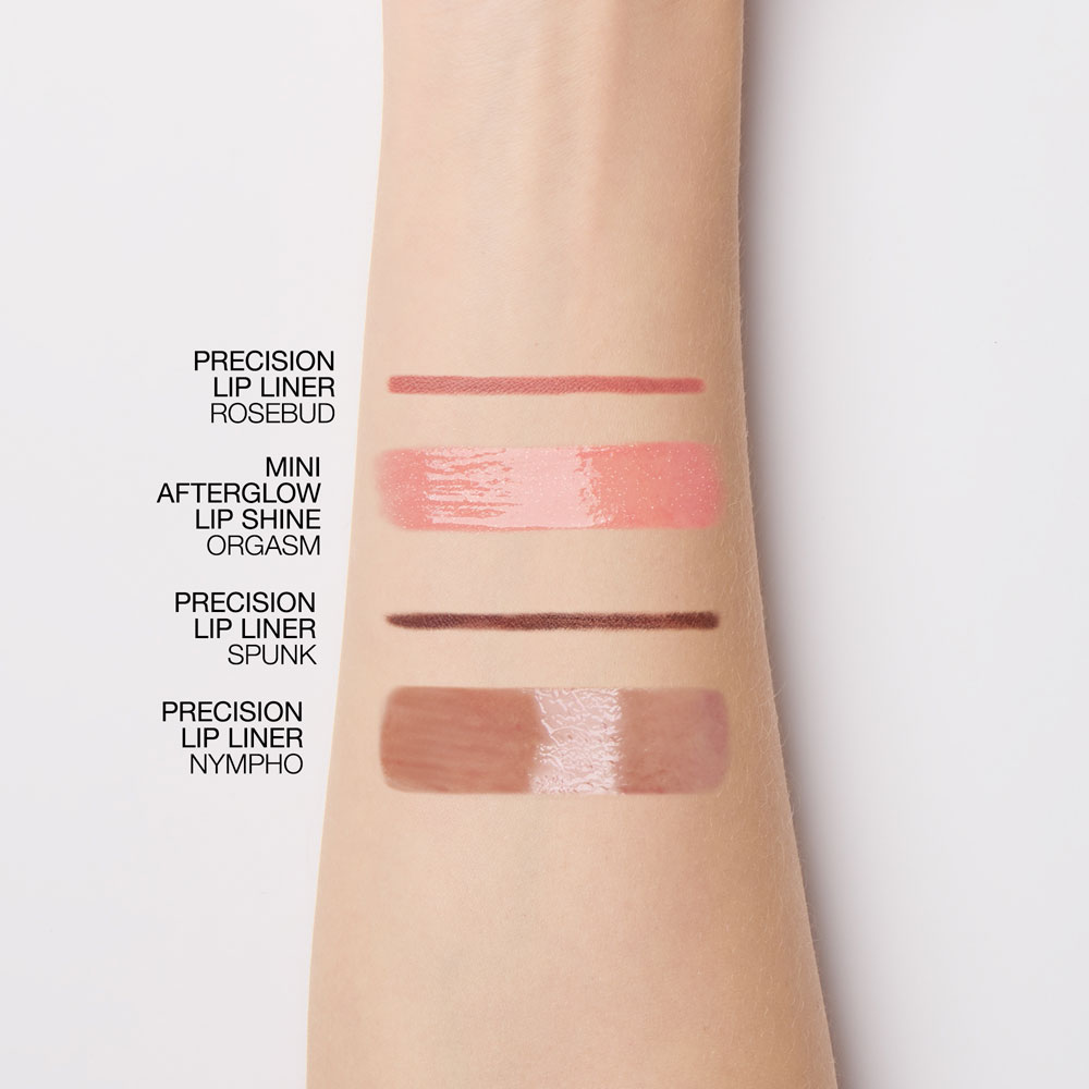 色彩のペアリングにこだわった、フルサイズのプレシジョン リップライナーとアフターグロー リップシャイン ミニのリップアイテムセット。高発色でシャープなリップラインとミラーのような光沢感で視線を惹きつける立体的な唇に。