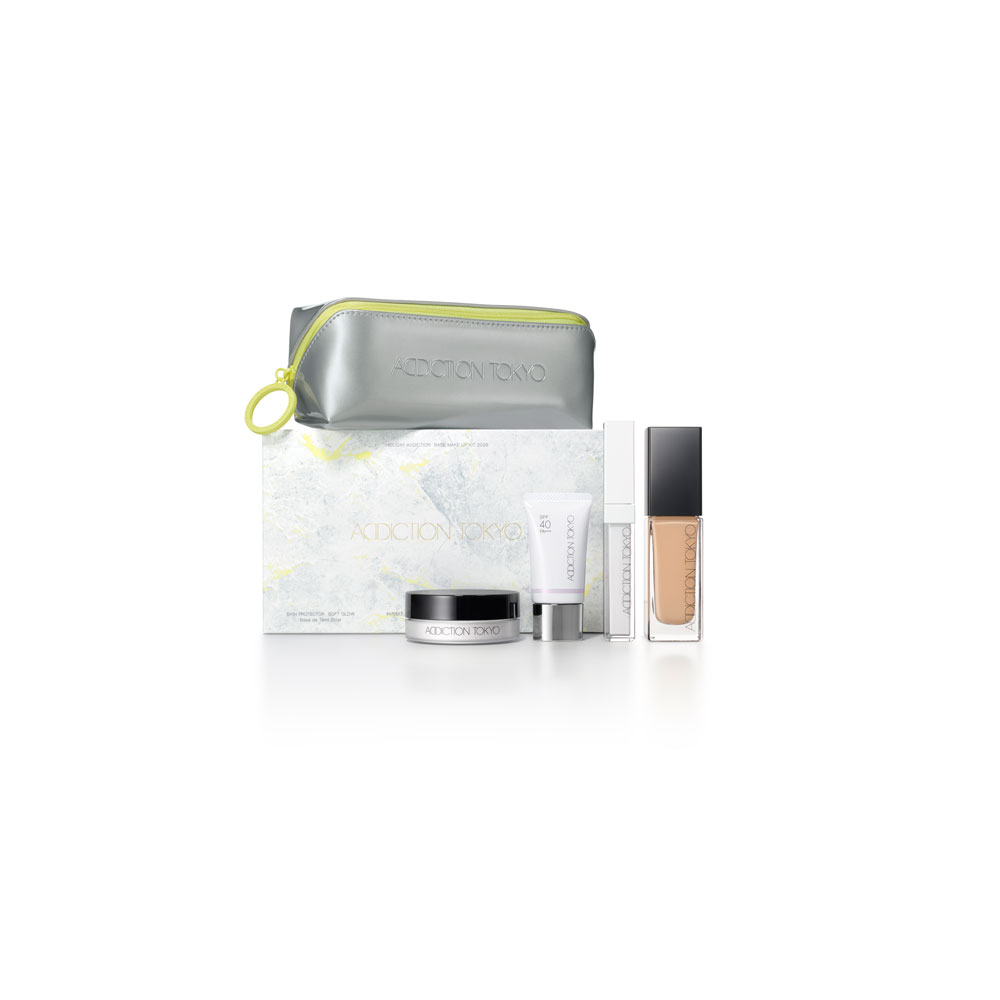 ハイライトのようなツヤが研ぎ澄まされた光を放つ。薄い膜が素肌感をそのままに、洗練された仕上がりを演出するベースメイクアップキット。