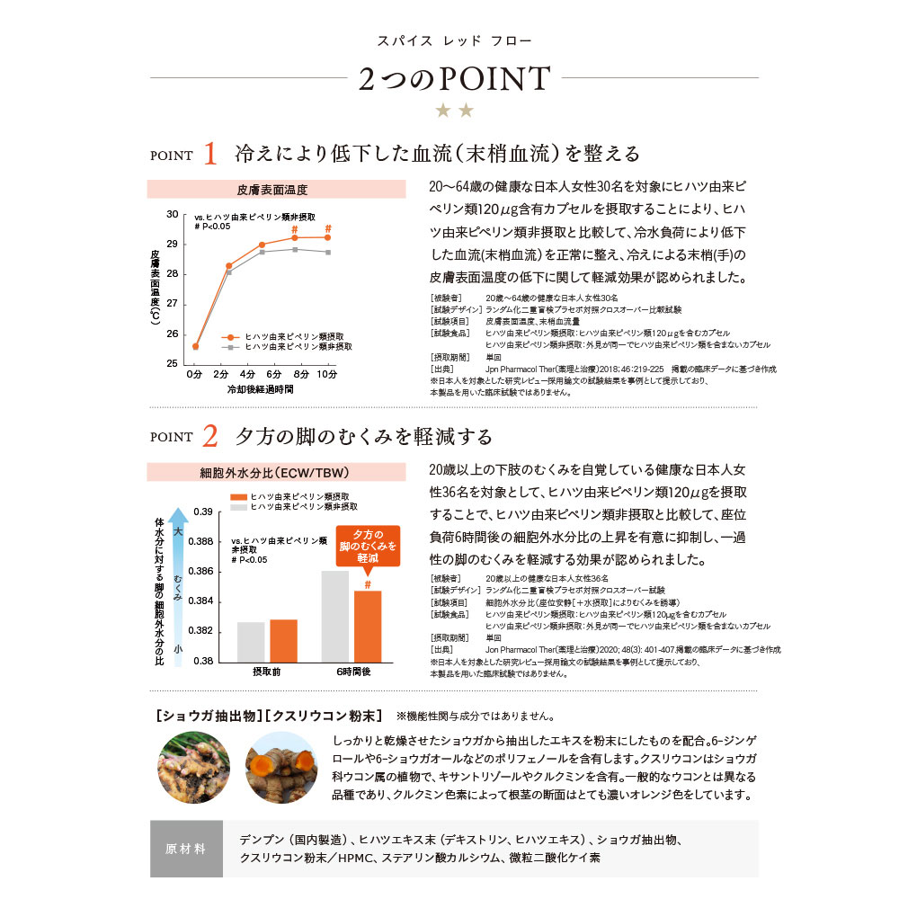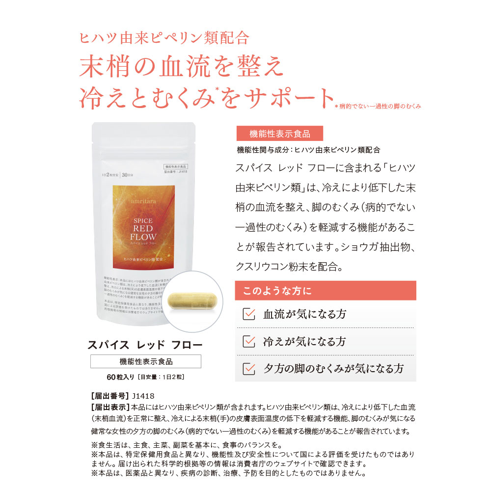 末梢の血流を整え、冷えとむくみ※をサポート。ヒハツ由来ピペリン類(機能性関与成分)配合。※病的でない一過性の脚のむくみ