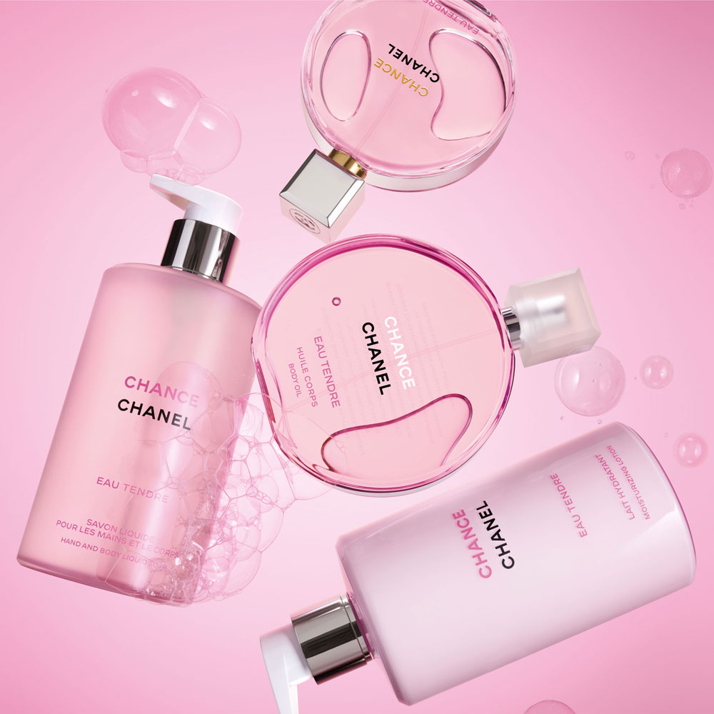 チャンス オー タンドゥル ボディ ローションを手のひらに適量とり、肌になじませます。同じ香りのハンド&ボディ リクィッド ソープとオードゥ パルファムで、香りのリチュアルが完成。