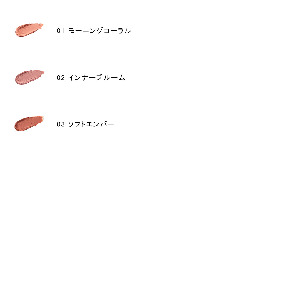 01 モーニングコーラル:やわらかな光を宿すフレッシュコーラル。 血色感を与えつつ、肌トーンを整えます。肌に溶け込むライトカラーでクマのカバーにも。