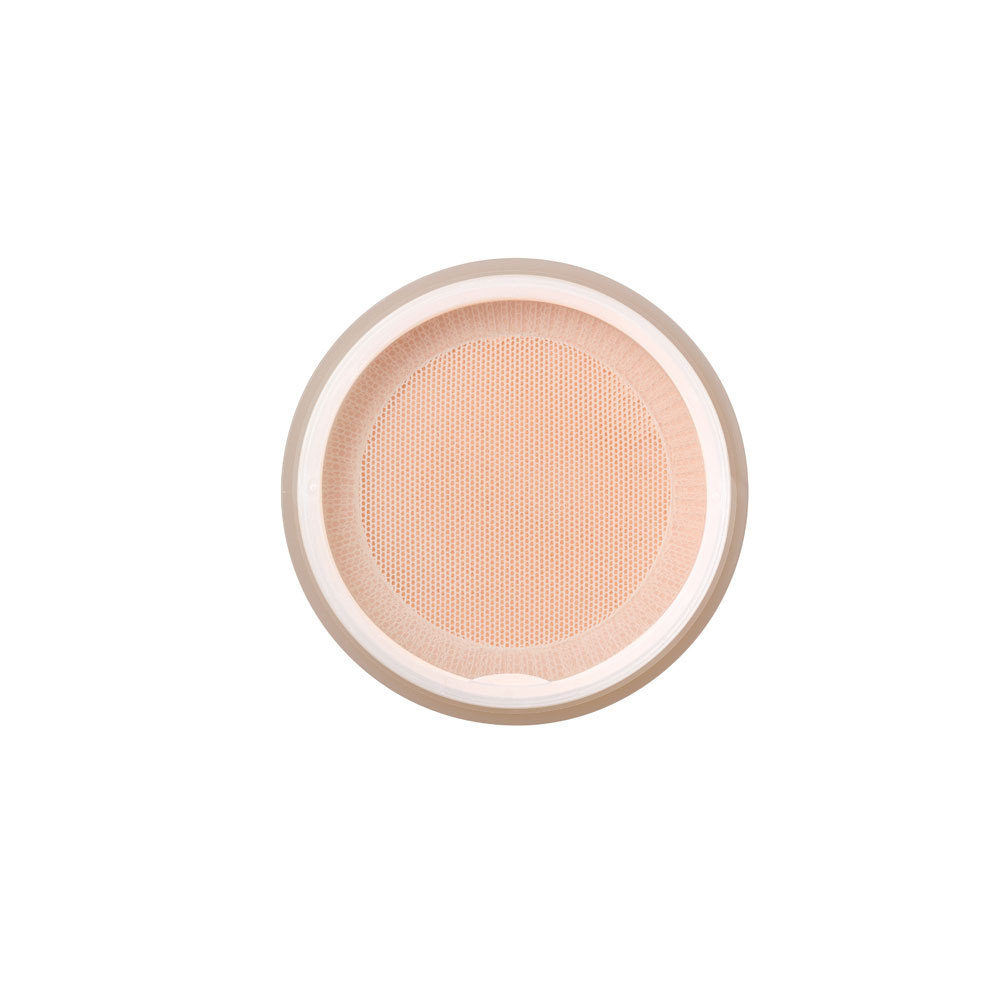 透明シート・パフを中に戻し、フタを閉めた状態で、1cmくらいの高さから平らな場所に向けて容器の底面をやさしくトントンとたたくようにすると、粉をメッシュの下に戻すことができます。※全て戻らないこともあります。