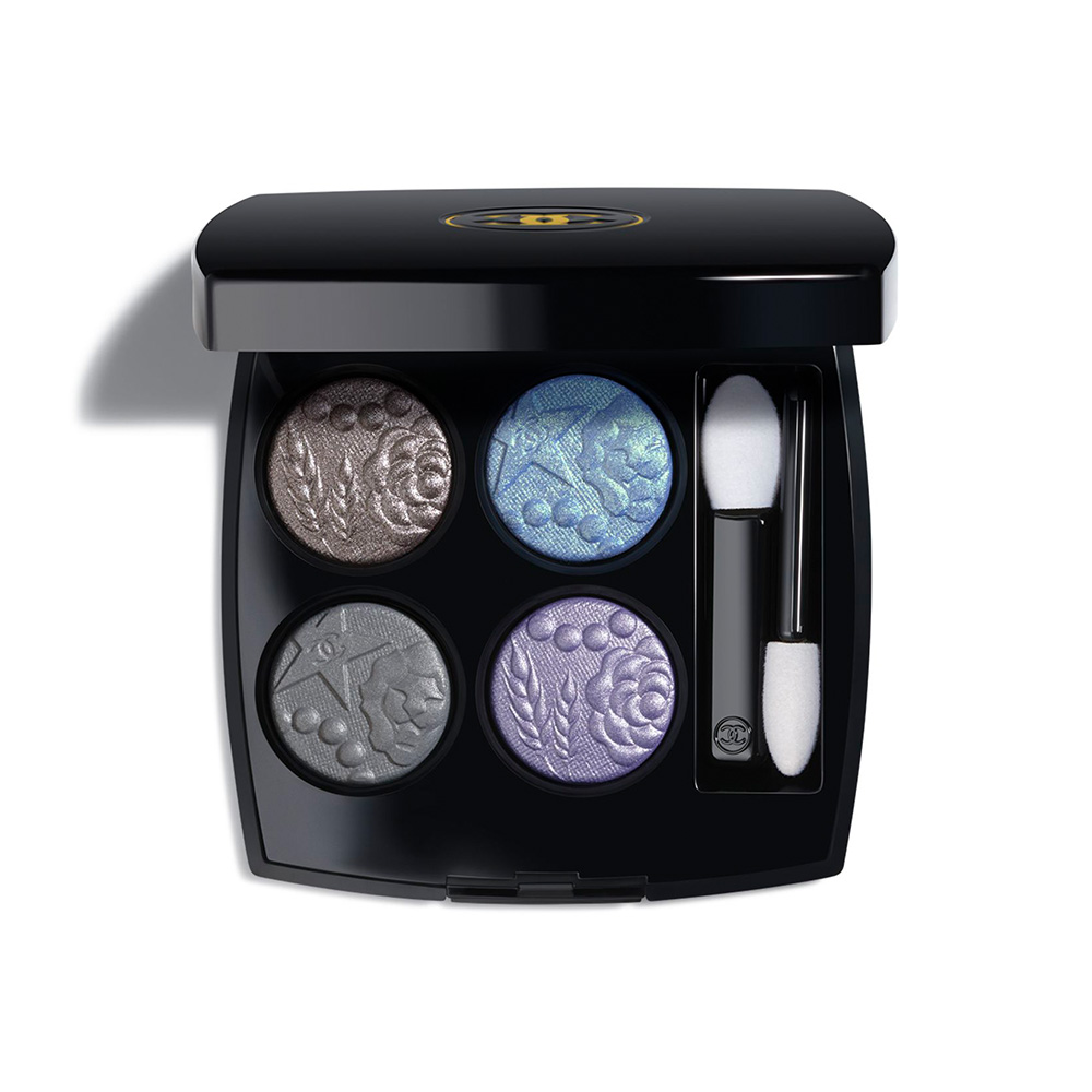 右上から時計回りに、輝くアクア ブルー ハイライター、サテンのラヴェンダー、マットなミディアム ブルー グレイ、輝くディープ パープル シルバー。特別限定品のアイシャドウパレットには、神秘的な色に染まる夜の美しさにインスパイアされた、宇宙や夜空を思わせる4つのシェードが揃う。複数の色を重ねたり、ミックスしたりして瞼にのせれば、質感の異なる色と光が目元に深みのある輝きを与えてくれる。表面にはシャネルの5つのシンボルであるライオン、カメリア、コメット、麦の穂、パールのモチーフが。