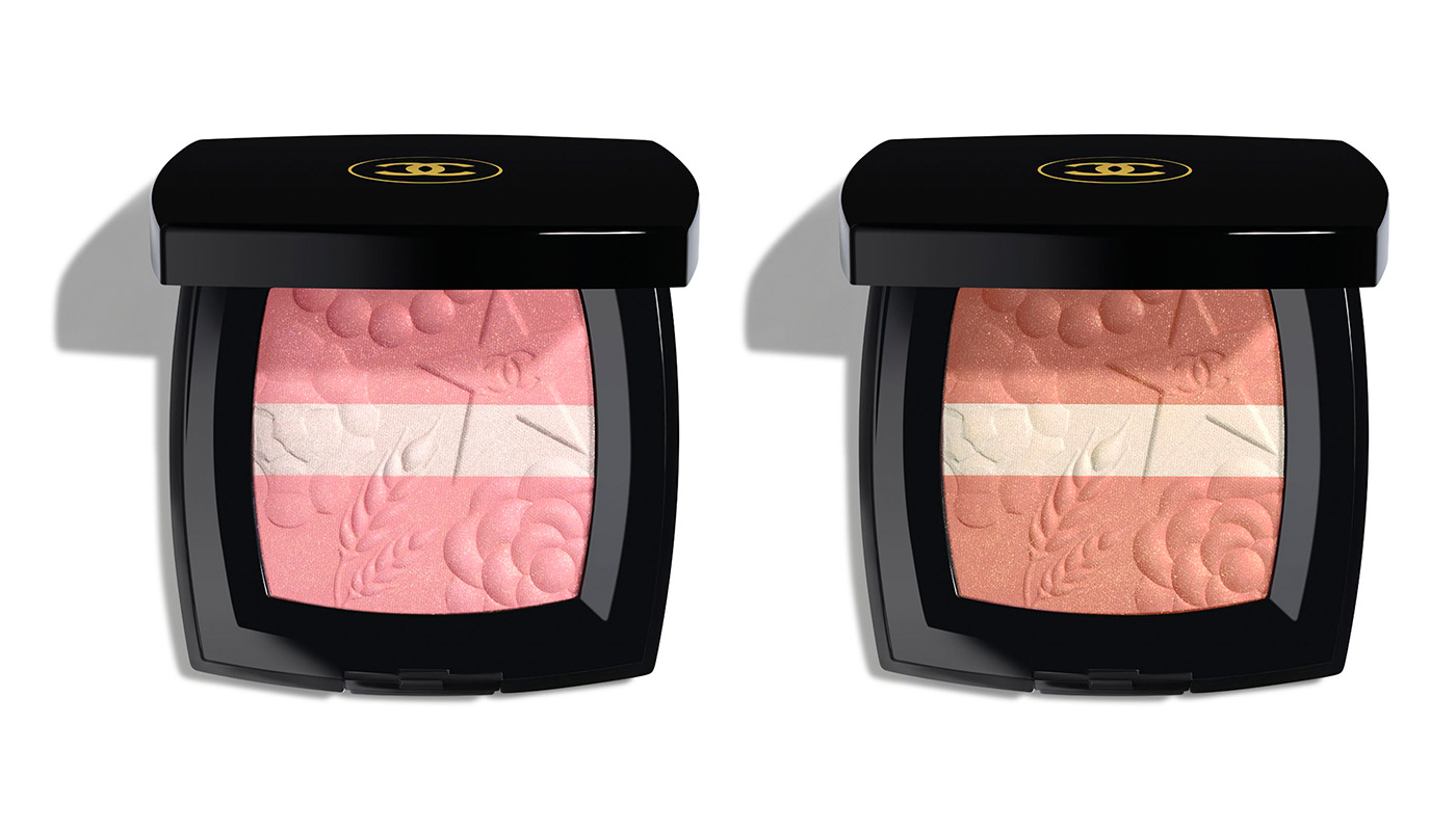チークカラーとパウダーハイライターがひとつになった特別限定品「レ シーニュ ドゥ シャネル」。星が放つ圧倒的な光からインスパイアされたこのアイテムは、サッとひと塗りでやわらかなサテンのようなつやが頬に宿る。ソフトな青みピンクと、 パールが輝くホワイト ピンクのハイライターの「997 ローズ ルミエール」(左)。オレンジウッドと、パールが輝くホワイト ゴールド ハイライターからなる「998 ペッシュ ルミエール」(右)。いずれも肌なじみのいい2色。パウダー表面にかたどられたシャネルの5つのシンボルは、まるで星座のよう。