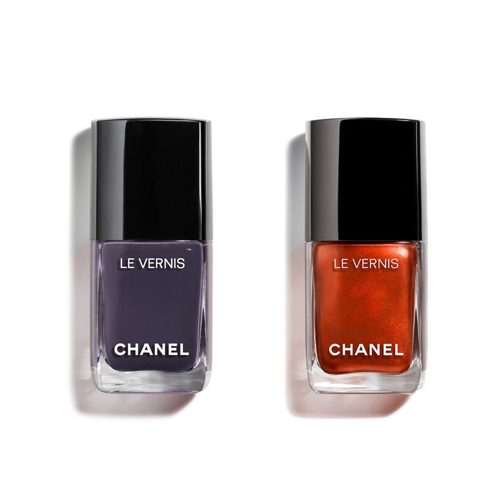 鮮やかなカラーが長時間持続するネイルエナメルにも、ホリデーの限定色が。指先に静かな空が広がるダーク グレイ ブルーと、炎のように燃えるメタリック オレンジ。天空を感じさせる2色が、冬の気分を盛り上げてくれる。