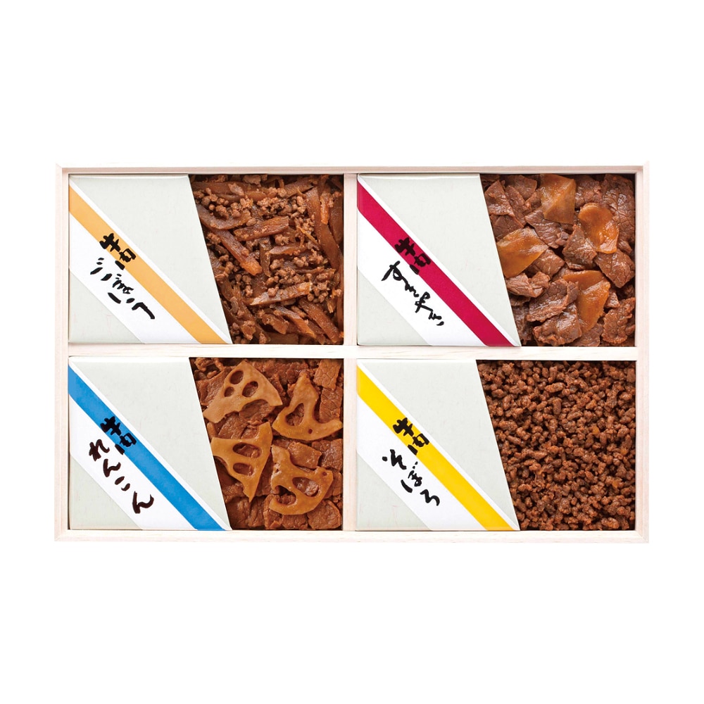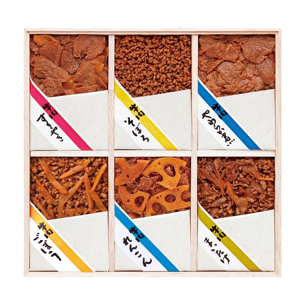 減塩 牛肉しぐれ・牛肉子持ちしぐれ煮・減塩 牛肉ごぼうしぐれ・減塩 鰹こんぶ・くるみとちりめん旨味炊き各50g、帆立うすだき40g、きゃら蕗60g