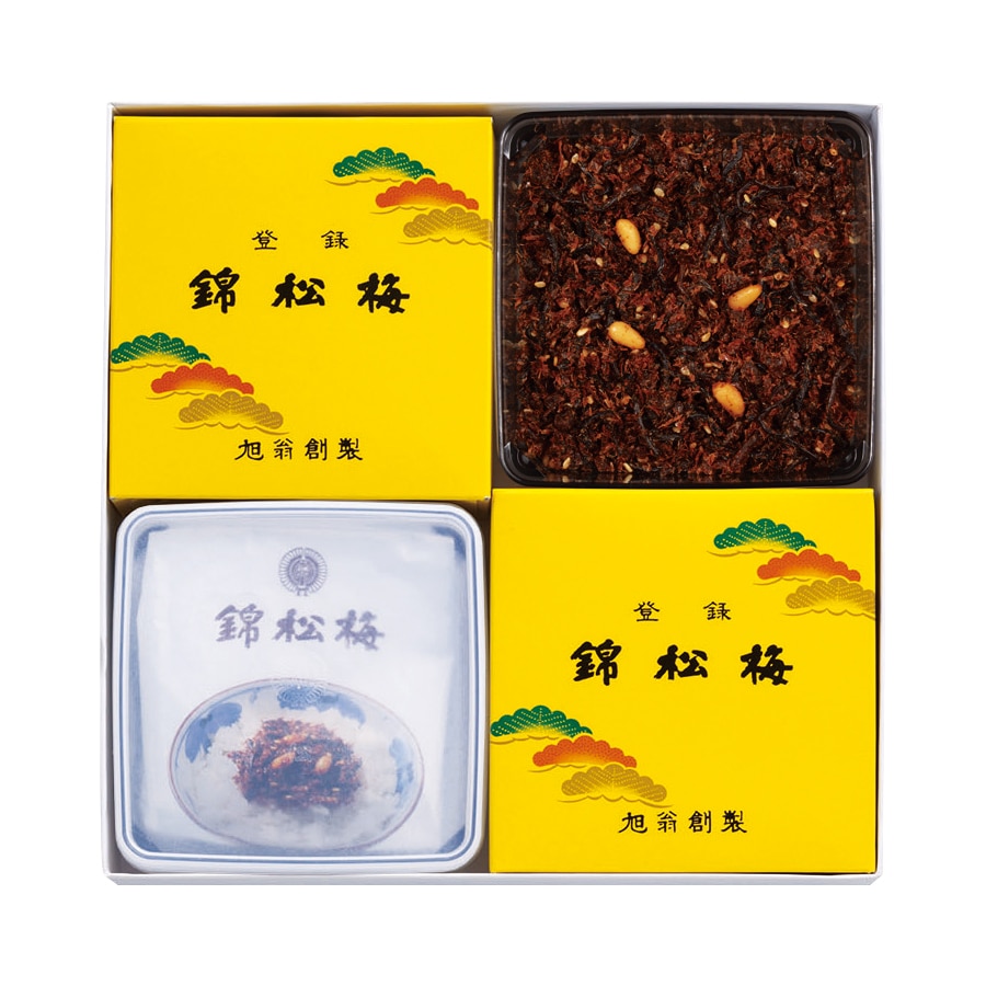 ちりめん山椒30g、焼き紅鮭43g、海老わかめ65g、木耳山椒55g、牛肉おぼろ煮・深山椎茸各60g、ちりめんくぎ煮・梅ひじき・しば漬ちりめん各50g
