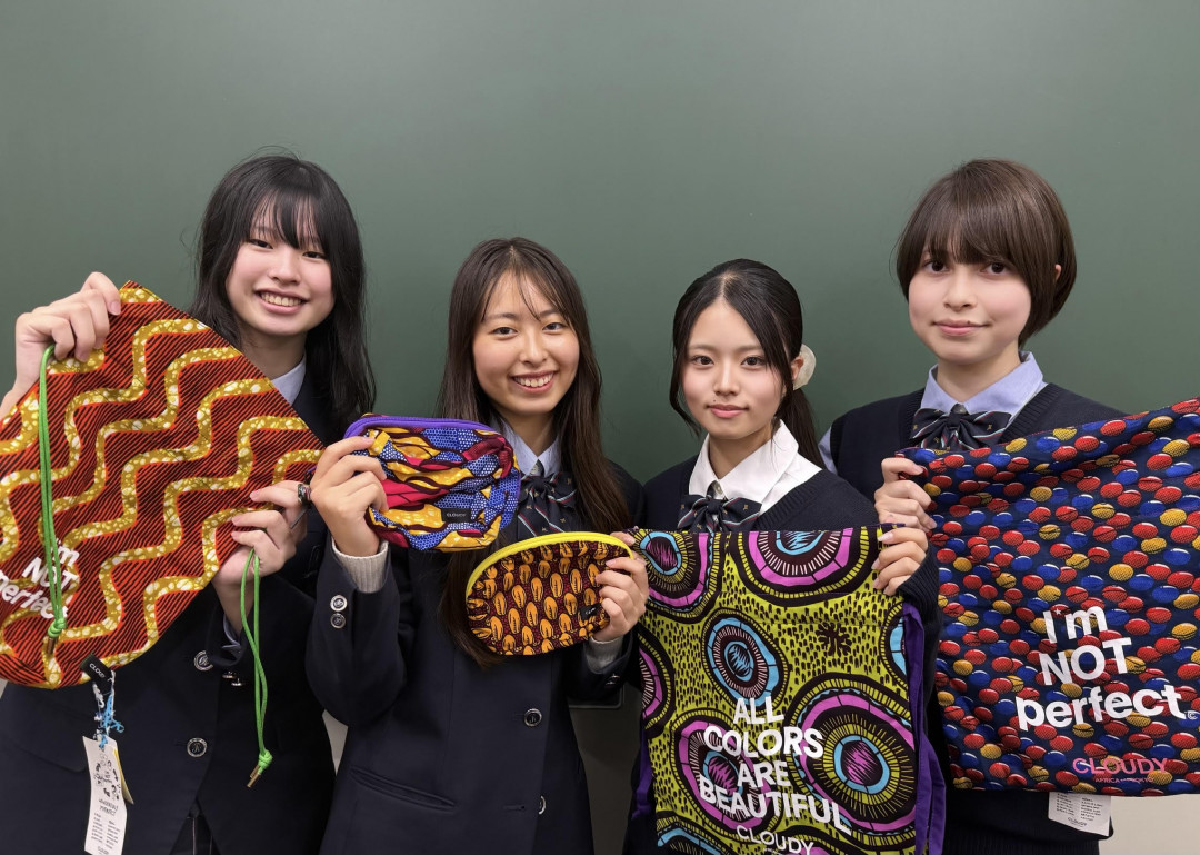 そして「CLOUDY」では、雇用創出を目的とした自社工場をアフリカのガーナで運営し、アフリカの伝統の生地や素材を使用した商品を展開する一方、アフリカ現地からお客様のお手元にお届けすることができなかった不完全なモノも存在する現状を生徒達は知りました。