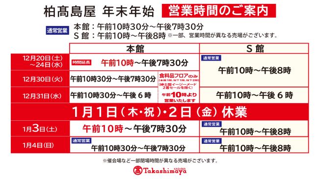 ■12月30日(火)は午前10時30~午後7時30分 ※本館1階・地下1階・地下2階の食料品フロア/催会場 (本館地下2階紳士服イージーメード2着セールを除く)は午前10時より営業いたします。