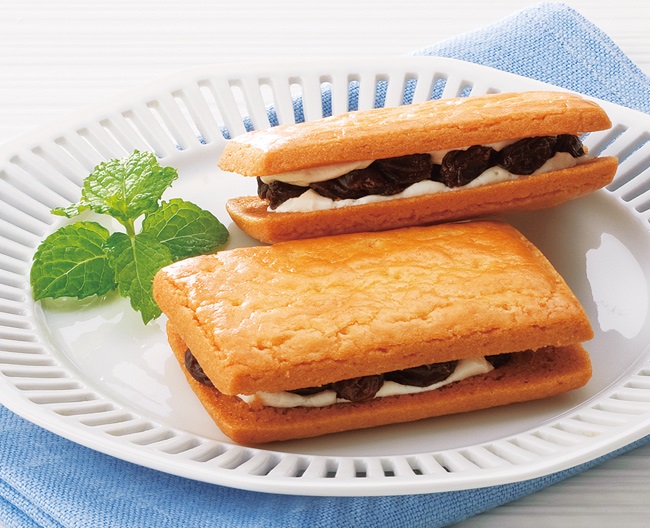 洋酒に漬けたレイズンと甘さ控えめのバタークリームをクッキーにサンド。