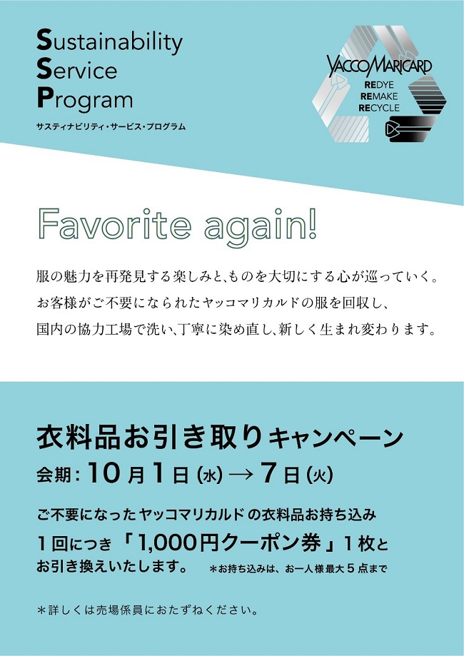 長く愛用したけれど、新しいワクワクする1枚に出逢いたい!というお客様に向けて、 ご不要になった[ヤッコマリカルド]の婦人服をお持ちいただいた方に、1枚につき1,000円の[ヤッコマリカルド]でご利用いただけるクーポン券を1枚進呈いたします。