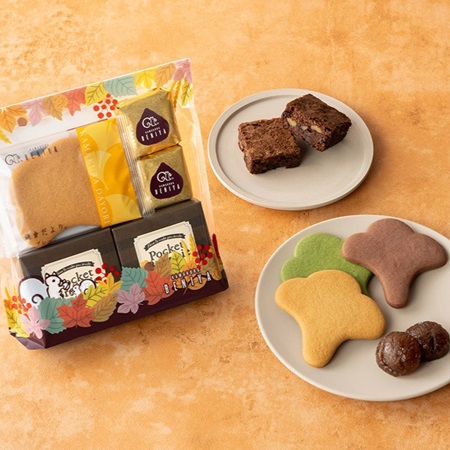 マロングラッセ、ポケットブラウニー、鎌倉だよりを、リスくんを描いた秋らしいデザインのスライダーポーチに詰め合わせました。