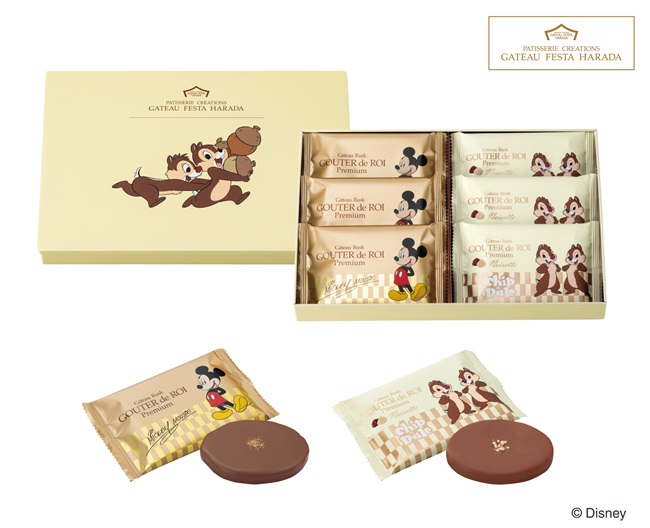 「グーテ・デ・ロワ プレミアム ミッキーマウスデザイン」と「グーテ・デ・ロワ プレミアム ノワゼット チップ&デールデザイン」の2種類のミルクチョコレートラスクを詰め合わせた「グーテ・デ・ロワ プレミアム・ノワゼットセレクション ディズニーデザイン」。