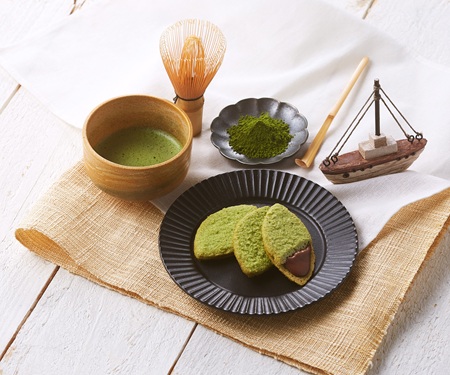 海に浮かぶボートのシルエットをモチーフに、チョコレートをサンドした抹茶とココナッツ風味のサブレ。