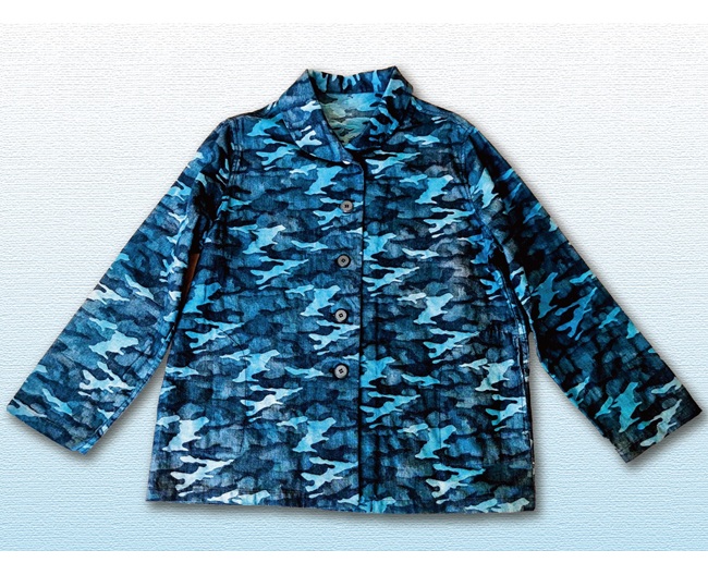 「藍染、柿渋染の創作衣料を羽織る」