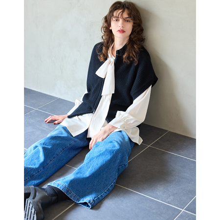 バルーンシルエットのカシミヤ30%混の上質なニットのジップベスト。