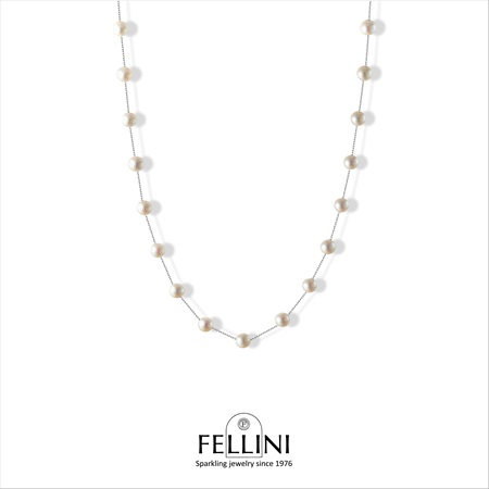 襟元から胸元にかけて煌めくチェーンの 輝きと、やさしいパールの光沢が連なる ロングタイプのネックレス。