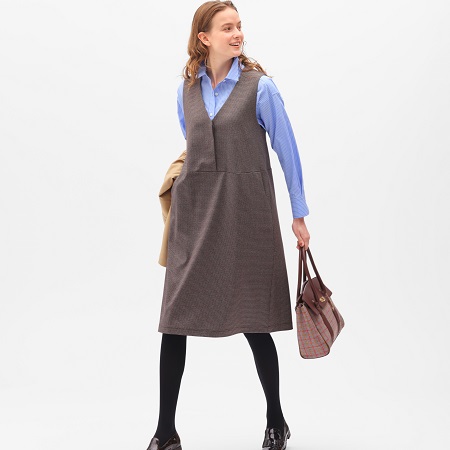 カットソーからタートルネックニットへなど、インナーを変えることで長く着まわせる万能ジャンパースカート。
