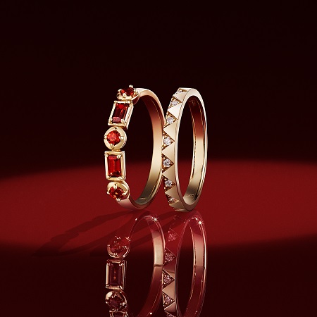 ガーネットとダイヤモンドの煌めきと、ゴールドのグラフィカルな模様がモダンなセットリングです。