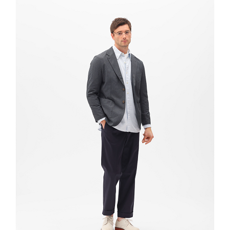 ウールのクラス感と、ジャージーのリラックス感が見事に調和されたセットアップは、ビジネス、カジュアルどちらのスタイルにも重宝します。