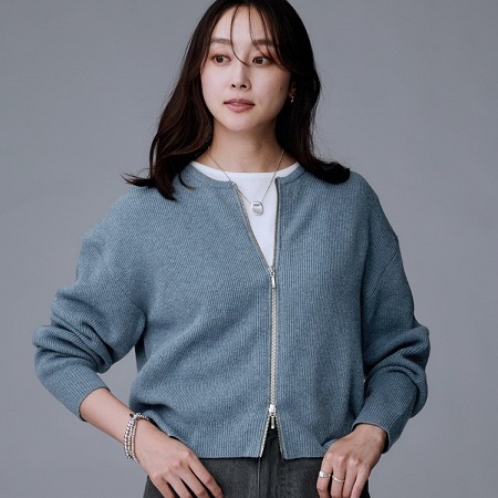 軽やかさとふくらみのあるニット素材のクルーネックZIPカーディガン。 少しゆったりとしたサイジングに短めの着丈でボトムスとのバランスを取りやすく、さりげ なくスタイルアップを実現。 トレンド感あふれる逆開ファスナー仕様は下を少し開けてインナーを見せたり、レイヤード スタイルにヌケ感とこなれ感を演出してくれます。