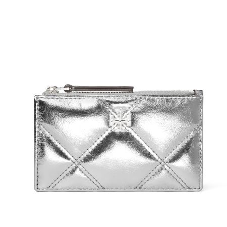ソフトでふっくらとしたダイヤモンドキルティング面取りカットのダブルT金具で引き立てました。メタリックなシルバーカラーの煌びやかなジップカードケースです。