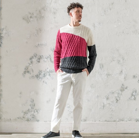 前身頃に3つの異なる編み柄をカラフルに組み合わせた デザインニット。ニットを主役にしたスタイルがおすすめです。