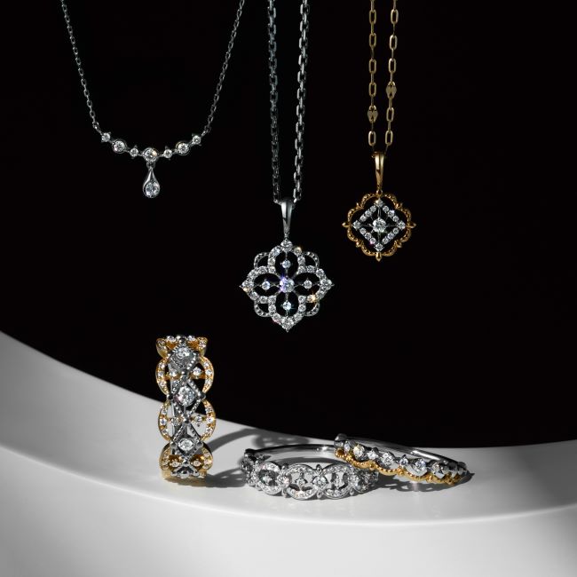 連なる光を繊細なディテールの透かし模様で表現した、“VINTAGE LACE”シリーズ。 まるで夜空を編んだようなデザインには、さりげなく月モチーフが施されているのがポイント。