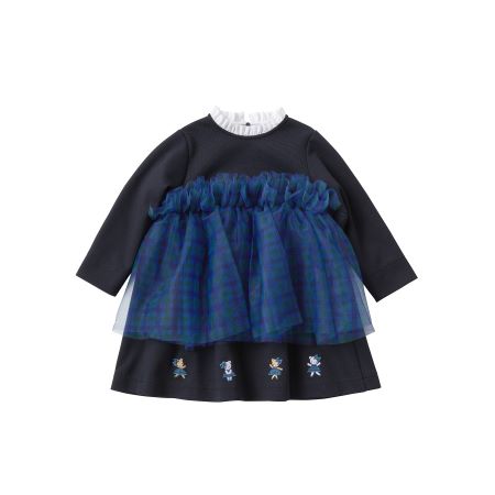 ギャザーのチュールを緞帳に見立ててステージの上でダンスをするクマちゃんたちを刺繍しました。 クマちゃんのつけている小さな立体リボンもポイント。お出かけにぴったりの一着です。