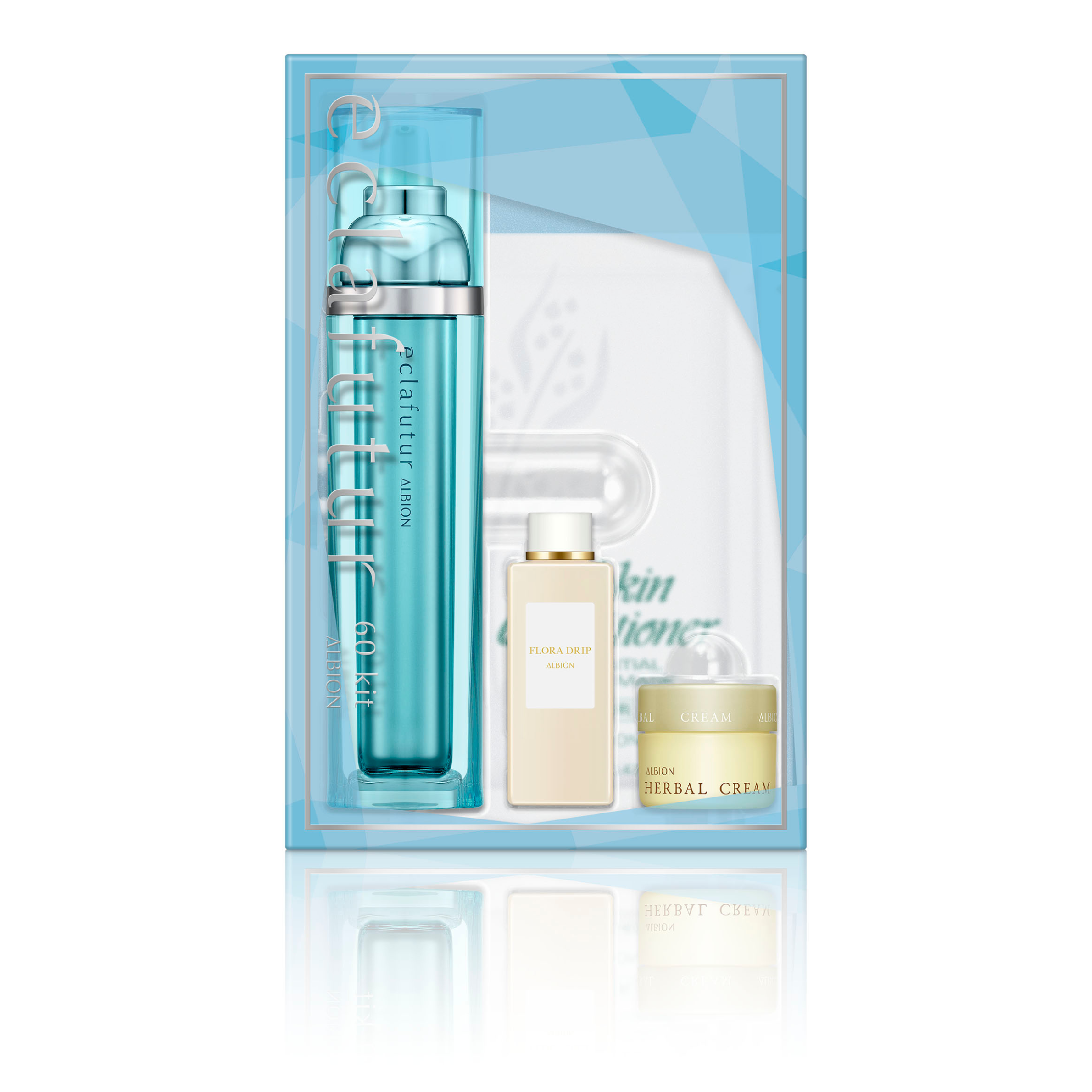 エクラフチュール t60mlの本体とレフィルが選べる。フローラドリップ s、スキコンマスク、ハーバルクリームなどアルビオンを代表するアイテムを同時に試せるスペシャルキットです。