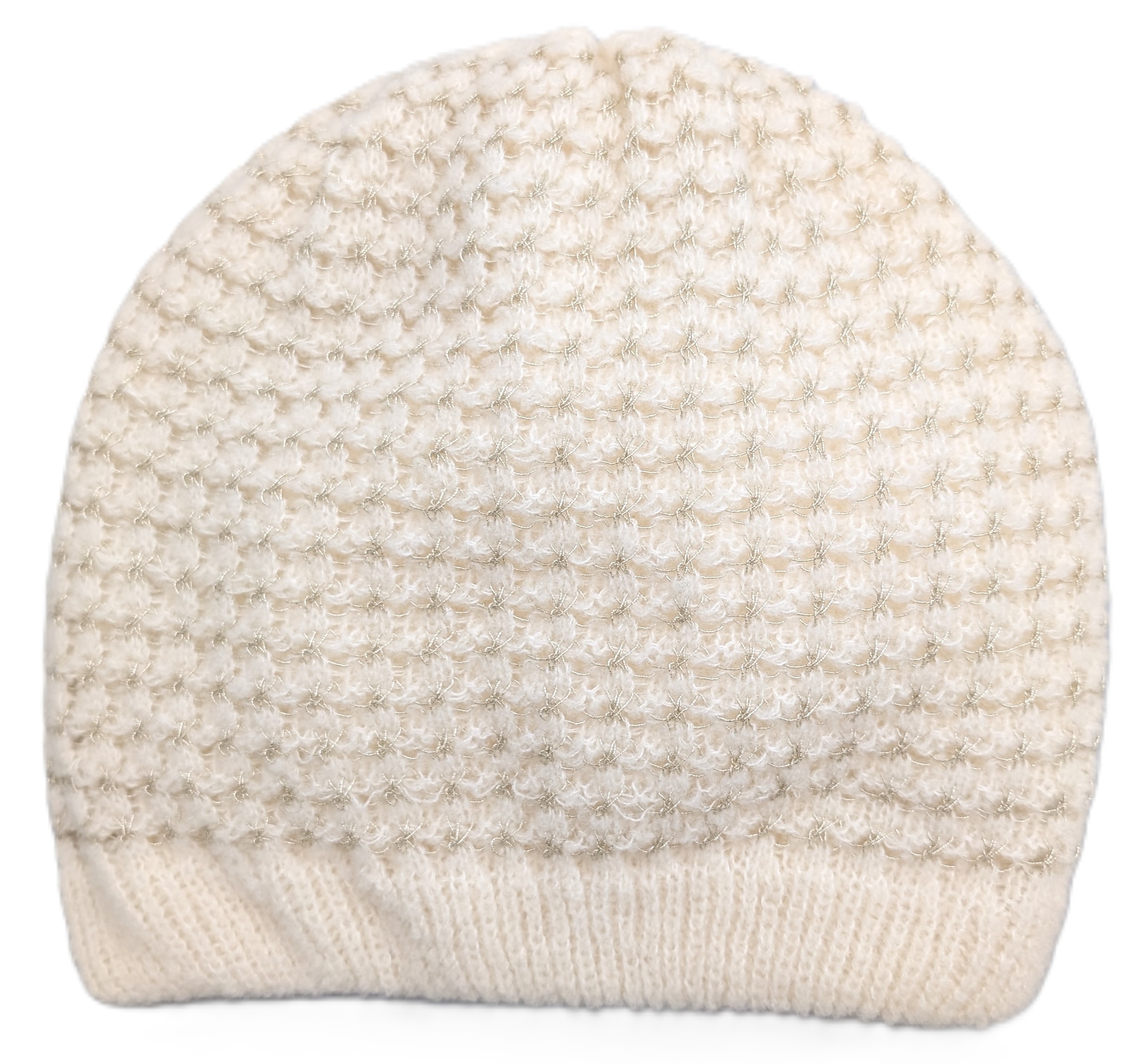 ラメ糸を編み込んだニット帽です。 ラメ糸が上品さを引き立てながら、可愛らしさも 感じられるデザインに仕上げました。
