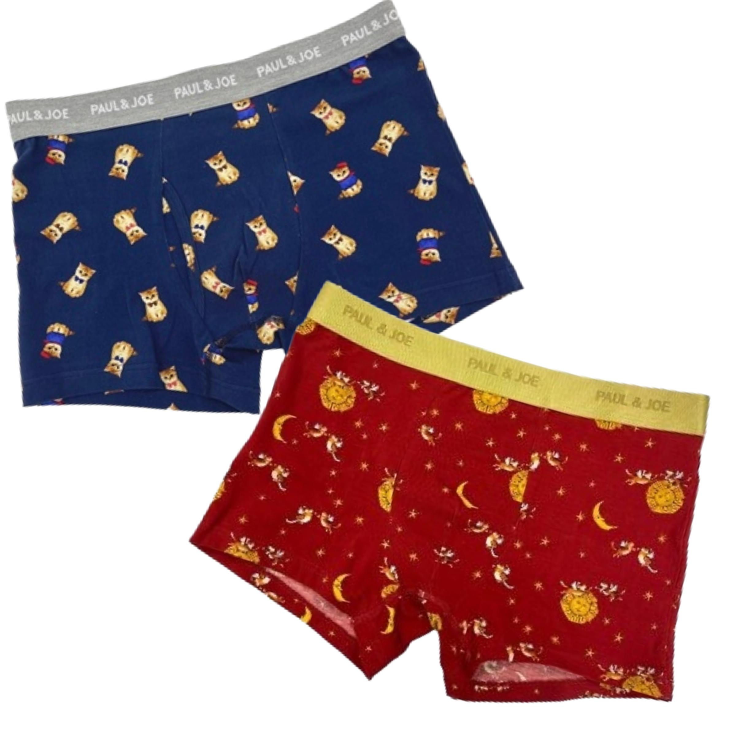 猫のヌネットが天使になって空を飛んでいるHAPPYな柄やちょこんとお座りしたキュートな柄など、可愛らしいデザインはクリスマスギフトにおすすめ。フロントは丸みのある立体的なパターンで圧迫感を軽減したボクサーパンツです。