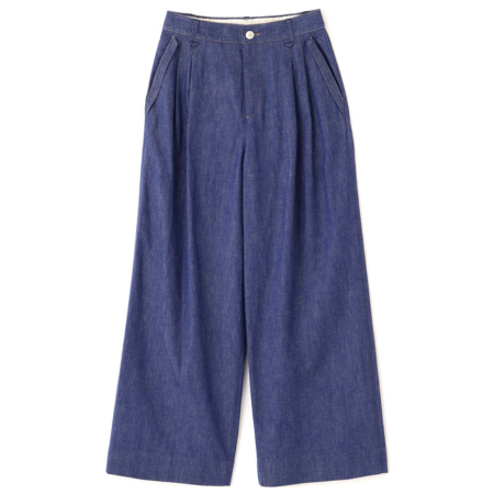 ダブルタックの綿麻デニムワイドパンツです。ポケットとベルトルーループに繊細なデザインを施してポイントにしています。すっきりシルエットのワイドパンツはリラックスした履き心地となっております。