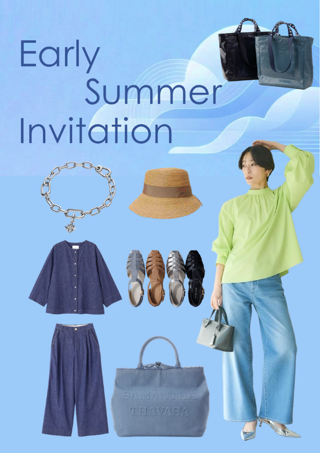 初夏を感じさせる爽やかなデニムシリーズ。ライトブルーとインディゴの2色展開で、爽やかなカジュアルスタイルと落ち着いた大人の雰囲気をそれぞれ表現しています。