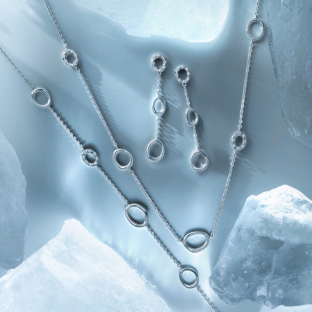 涼やかな風に揺らぎ、形を変えながらゆったりと流れてゆく水面のシルエットを、プラチナとダイヤモンドで滑らかに描いたジュエリー。 柔らかなニュアンスを帯びたプラチナのパーツは、フォルムや大きさを変えてレイアウトし、自由に変化する水面を表しています。