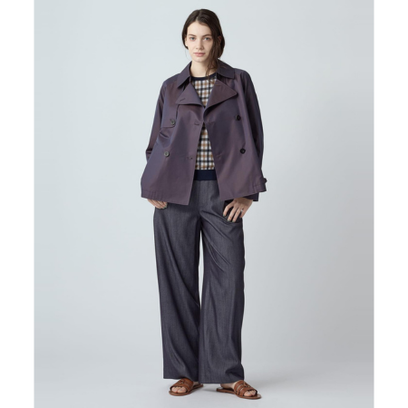 サステナブルなデニム調素材を使用したワイドパンツです。 脚のラインを拾わず、美しいドレープを描く大胆な分量感が、スタイリングに迫力を与えます。トップスには、ブランドアイコンのクラブチェックを繊細なジャガード編地で表現したニットプルオーバーをあわせています。 また羽織には、ブランド175周年のアニバーサリーカラーであるイングリッシュパープルを彷彿とせるショートトレンチコートを合わせ、クラシックさとモダンな要素を兼ね備えたスタイリングに仕上げております。