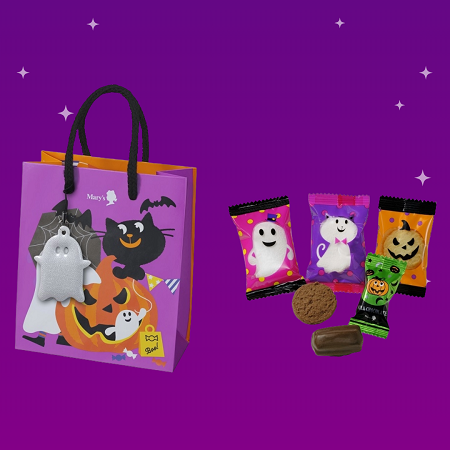 黒猫やカボチャ、おばけたちが描かれた楽しいミニバッグにチョコレートやクッキーを詰め合わせました。おばけのストラップ付きです。