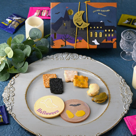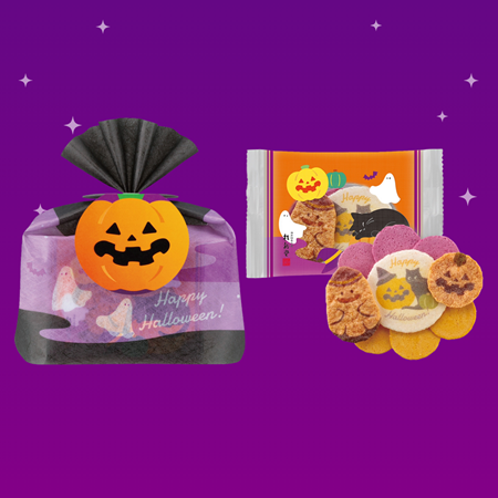 おばけや猫の絵柄と、南瓜・紅芋のえびせんべいが楽しめるハロウィン限定商品です。