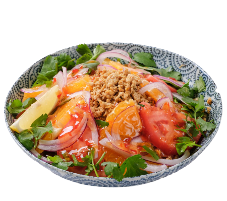 熊本県産デコポン®とトマト、パクチー香るガパオ。蕎麦つゆ×ナンプラー、スイートチリで味変も。