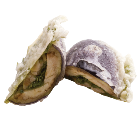 熊本県産の茄子にお魚のすり身をたっぷりつけて揚げました。生姜醤油でお召し上がりください。