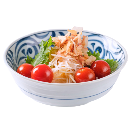 しゃきしゃきの細切り大根サラダのアクセントに大葉をのせて、熊本県産ミニトマトをのせました。