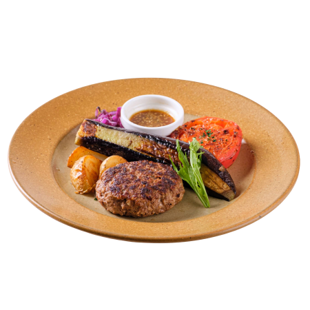 - 国産牛ハンバーグと熊本県産鉄板焼き野菜の盛り合わせ 1,990円
