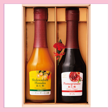 母の日におすすめのミニカーネーション(造花)が付いた ギフトです。爽やかな酸味とほのかな苦味が特長の「シークヮーサーと八朔の酢」と ざくろ特有の渋みとすっきりとした酸味の「ざくろの酢」を詰合せました。