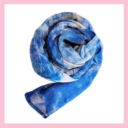 一点一点手染めで仕上げた藍染スカーフです。手仕事ならではの奥行きのある色合いと、やさしい風合いをお楽しみいただけます。すべて手染めのため、同じ色・柄のものは一枚として存在しない、特別な一点物です。