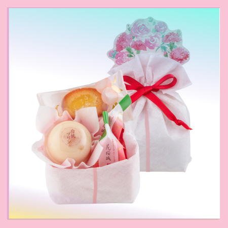 甘さすっきりと蜜漬けしたさくらんぼをやわらかなぜりぃで包んだ「花桜桃」、白桃果肉入りのなめらかな口あたりの「白桃プリン」、白桃の果肉をのせたアーモンド香るフィナンシェ「白桃フィナンシェ」の3種類をお詰めしました。 季節の人気商品をブーケをイメージしたパッケージにお詰めしました。